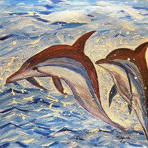 I visited Sydney and the Taronga Zoo, where I enjoyed the live seal show. This reminded me of the loving dolphins and inspired me to paint them in a blissful, carefree mood. Here’s my creation of friendly, playful dolphins having fun together.